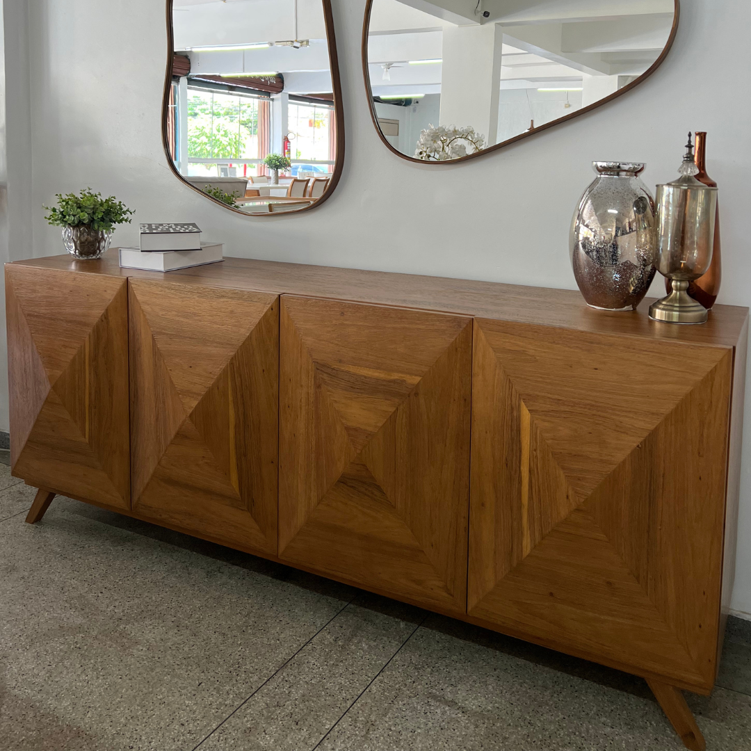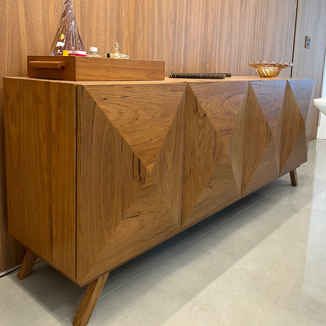 Este buffet é uma peça de mobiliário que combina funcionalidade, elegância e um toque de sofisticação artesanal. Sua estrutura é totalmente construída em madeira maciça, garantindo durabilidade e um aspecto robusto, ao mesmo tempo que exala calor e charme natural. O design do móvel é pensado para ser versátil, podendo ser utilizado em salas de jantar, salas de estar ou até mesmo em halls de entrada, oferecendo espaço de armazenamento e uma superfície superior para exibir objetos decorativos ou servir refeições.
